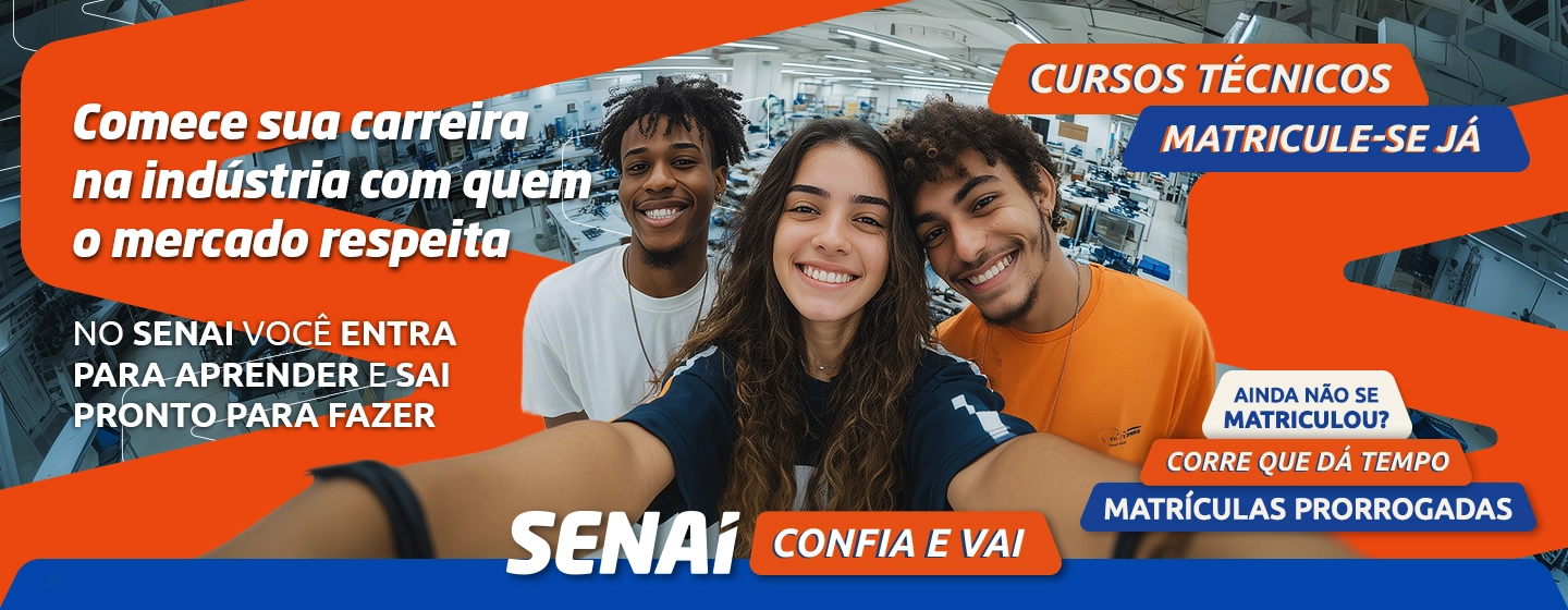 Nossa formação une teoria e prática para preparar você para o mercado de trabalho, com aulas que simulam os desafios reais da indústria. Nos cursos técnicos do SENAI, o aprendizado é movimento. Enquanto uns ainda estão planejando, você larga na frente.